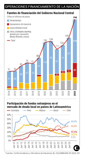 En lo corrido de 2025, el uso de fuentes internas —como los TES, TES de corto plazo y pagarés del Tesoro— ha cobrado relevancia, superando el 80 % del financiamiento del Estado. Esto representa un giro hacia depender menos de deuda externa. - Presión fiscal y déficit elevado