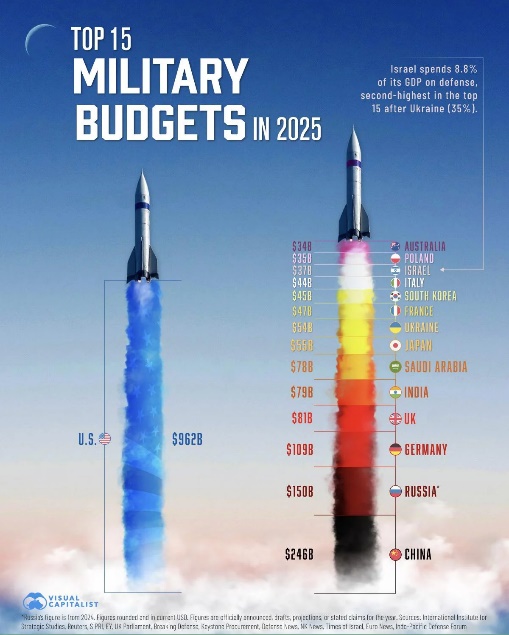 Las exportaciones rusas de armas cayeron un 26% entre 2021 y 2025 respecto al quinquenio previo, indicó el último estudio del Instituto de Investigaciones para la paz de Estocolmo (SIPRI por sus siglas en inglés) Bajo esa política agresiva, de presiones, amenazas y chantajes, en el mismo período mencionado, las ventas globales de armas estadounidenses crecieron hasta ser más del doble que las de Rusia, el segundo mayor exportador. (7) pero con un Estados Unidos absolutamente en primer lugar en presupuesto para la guerra concretando el 40% del total de gastos militares del mundo según el presupuesto del año 2025