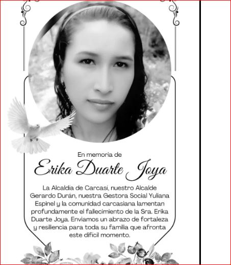 Alcaldía de Carcasí expresó que «la comunidad carcasiana lamenta profundamente el fallecimiento de la señora Érika Duarte Joya».
