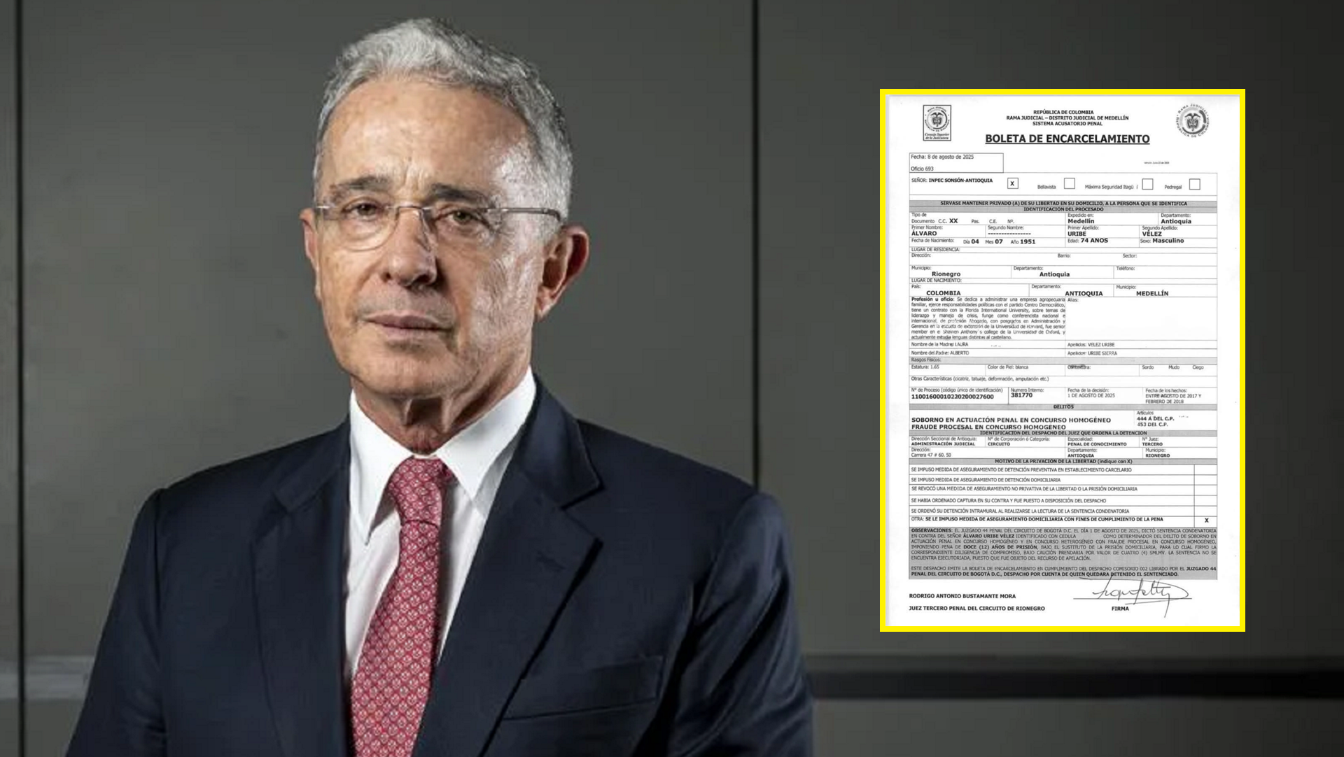 Tras la condena impuesta por la jueza Sandra Heredia por los delitos de fraude procesal y soborno en actuación penal, se ordenó la emisión de la boleta de encarcelamiento, con traslado inmediato del expresidente a su residencia en Rionegro, Antioquia, donde debe cumplir prisión domiciliaria.