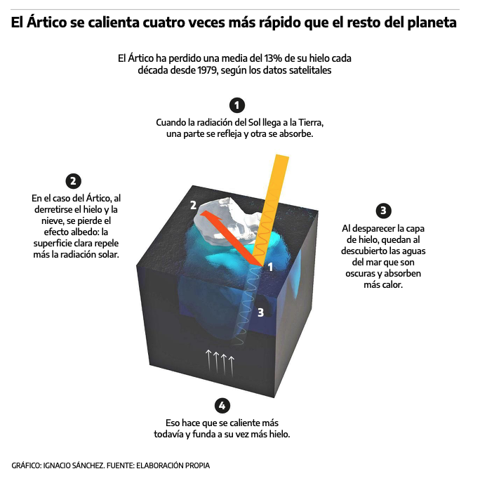 El cambio climático causado por el hombre derritiéndose el ártico. El planeta, calentado por la cúpula de gases emitidos por la quema de combustibles fósiles, está derritiendo el casquete polar. Desde 1979 ha perdido más de dos millones de kilómetros cuadrados de hielo. Cada década, el 13% de la capa congelada se derrite para siempre y el hielo más antiguo y grueso se ha reducido en un 95%. Este deshielo abre rutas comerciales rentables, como el Puente de Estambul, y acceso a vastos recursos naturales. El Ártico ha pasado del norte helado a una de las zonas geopolíticas más cálidas.