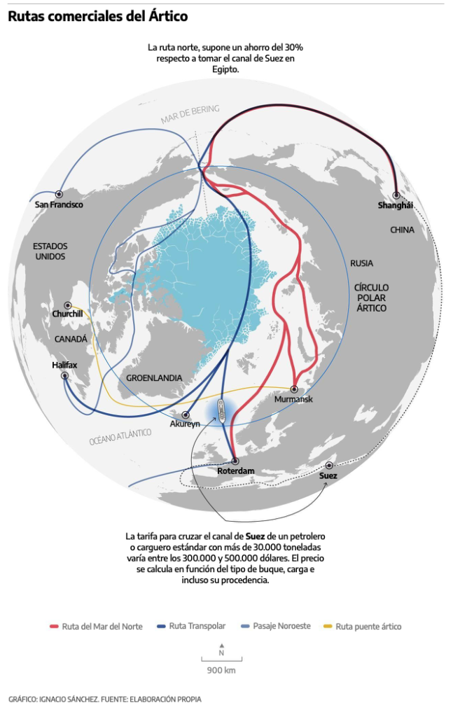 Y no se trata sólo de extraer o perforar. Se estima que la Ruta del Norte que pasa por la costa rusa ahorrará un 30% de tiempo respecto a la que pasa por el Canal de Suez. Este canal, que conecta artificialmente el océano Índico y el Mediterráneo, está actualmente gestionado por Egipto. Ir allí significa pagar una tarifa de 300.000 a 500.000 dólares por un carguero o camión cisterna estándar.