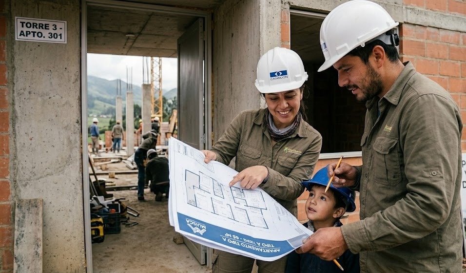 [Imagen: Familia joven mirando planos frente a un edificio en construcción con casco de seguridad]