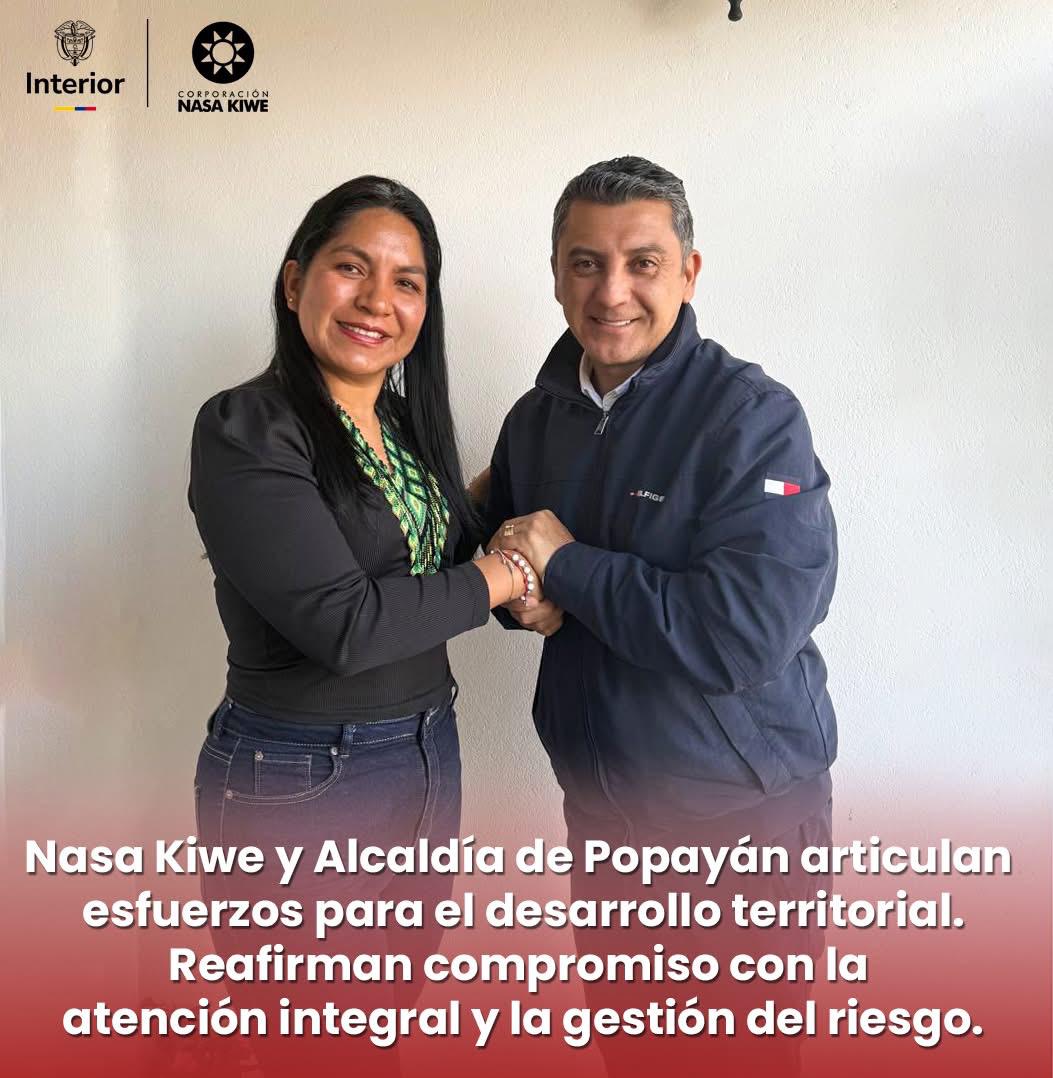 La Corporación Nasa Kiwe continúa avanzando en la consolidación de procesos de articulación interinstitucional que permitan implementar acciones integrales y efectivas en el territorio. En ese marco, se llevó a cabo una reunión entre la directora general de la Corporación, Astrid Natalia Trujillo Campo, y el alcalde de Popayán, Juan Carlos Muñoz Bravo, con el propósito de establecer canales de diálogo y cooperación que fortalezcan el trabajo conjunto.