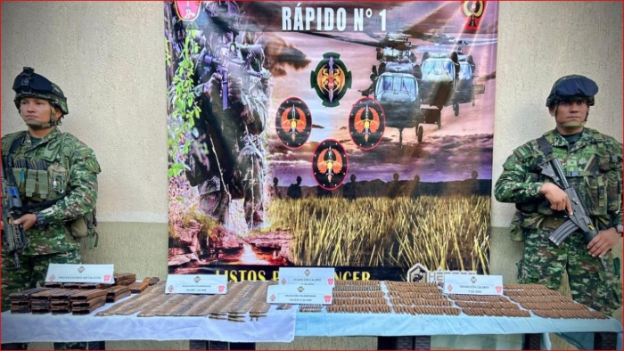 Según la Fuerza de Tarea Omega del Ejército, en La Macarena»Este material sería distribuido y utilizado con el propósito de realizar ataques terroristas en contra de la población civil y la Fuerza Pública»