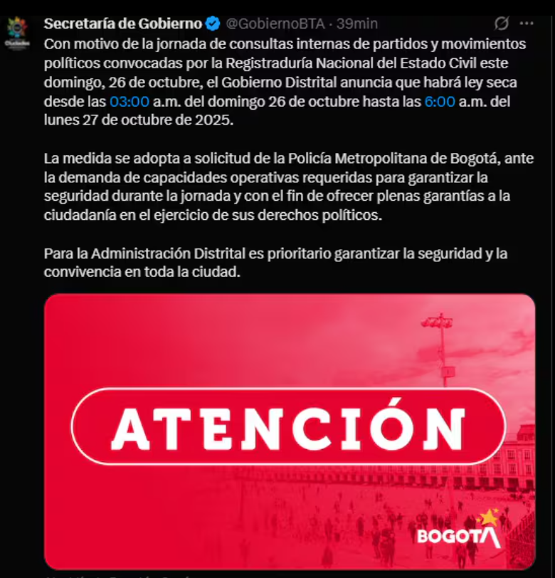 La Bogotá vivirá una jornada especial este domingo 26 de octubre y la madrugada del lunes 27 como parte de la preparación para la consulta interna de la coalición Pacto Histórico. La Alcaldía Mayor de Bogotá ha decretado la aplicación de la conocida “ley seca” en todo el distrito capitalino, con el objeto de garantizar el orden público, la seguridad ciudadana y el normal desarrollo del proceso electoral.