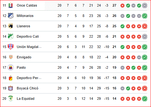 Fortaleza, la gran revelación del torneo, se encuentra en el 6° lugar con 35 puntos, los mismos que Junior de Barranquilla, luego de ganar 9 partidos y perder sólo 3.