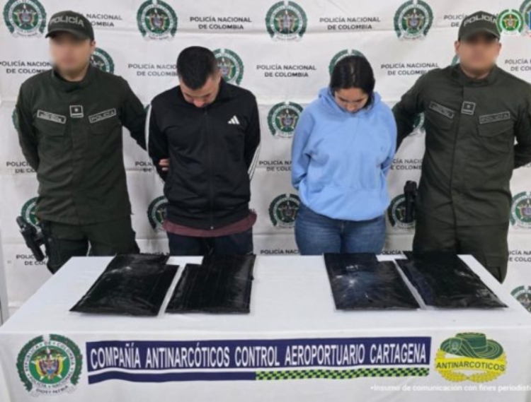 Las autoridades aeroportuarias del Aeropuerto Internacional Rafael Núñez de Cartagena detuvieron a una pareja que intentaba transportar un cargamento de sustancias ilícitas hacia el continente europeo. Los sospechosos, identificados como Andrey Yessi Mancilla y Mayra Alejandra Rodríguez, pretendían abordar un vuelo con escala directa hacia Madrid, España, el pasado 17 de enero. Durante las labores de perfilamiento y control de pasajeros, los uniformados detectaron anomalías en el equipaje de los implicados, lo que motivó una inspección detallada de sus pertenencias. Por consiguiente, la Policía Nacional procedió con la captura inmediata de los ciudadanos tras confirmar la presencia de material sospechoso en sus maletas de viaje.