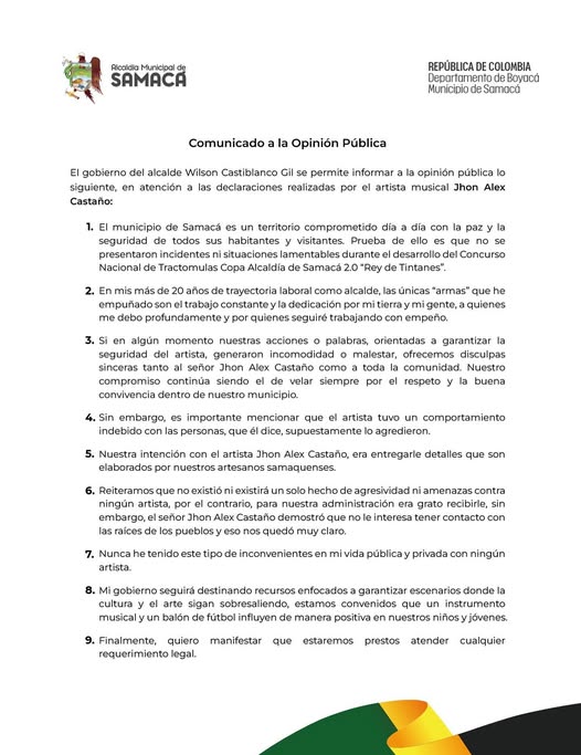El cantante de música popular Jhon Alex Castaño denunció públicamente haber sido víctima de presuntas amenazas e intimidaciones por parte del alcalde de Samacá, Wilson Castiblanco Gil, durante un concierto en el municipio.
