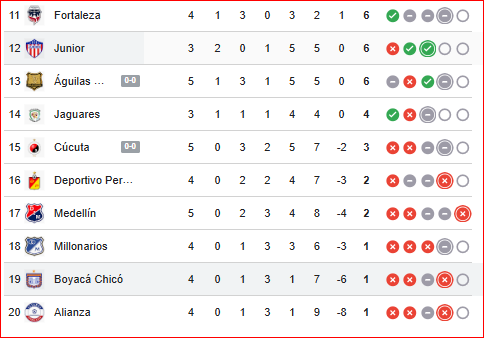 Junior está en el lugar 12 y acumula 6 puntos mientras que Boyacá Chicó ocupa la casilla 19 y tiene solo un punto.