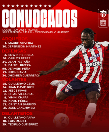 Junior: Jefferson Martínez; Edwin Herrera, Jean Pestaña, Jermein Peña, Yeison Suárez; Jesús Rivas, Guillermo Celis; Yimmi Chará, Cristian Barrios, Luis Muriel y Guillermo Paiva.