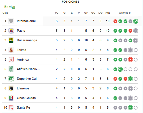 Internacional y Deportivo Pasto tienen 10 puntos, lo que los ubica en los primeros lugares del Tabal de la Liga Betplay. En tercer y cuarto lugar está Bucaramanga con 9 anotaciones y Tolima con 8 puntos.