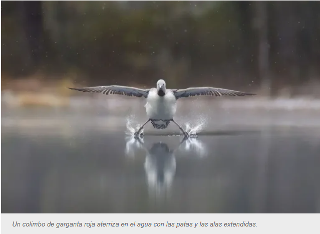 Lur de garganta roja aterriza en el agua con las piernas y las alas abiertas.