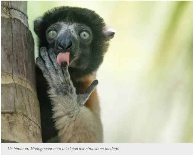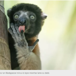 Un lémur de Madagascar mira a lo lejos mientras se lame un dedo.