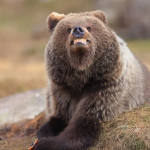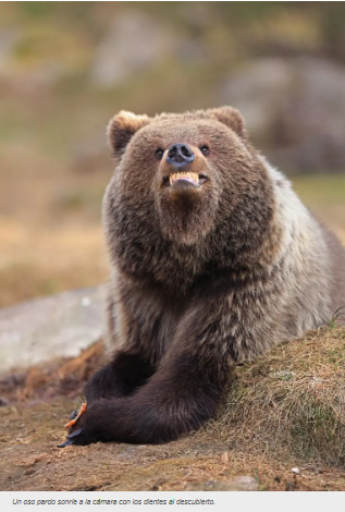 Un oso pardo sonríe a la cámara con los dientes desnudos.