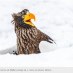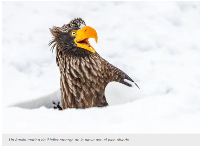 Un águila marina de Steller emerge de la nieve con el pico abierto.