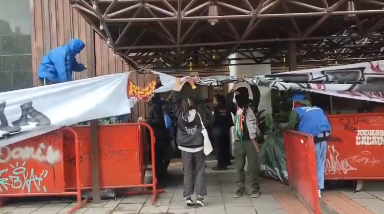 Un grupo de encapuchados ejecuta una ocupación simbólica en el edificio donde funciona el Ministerio de Agricultura en Bogotá, instalando cambuches en la parte baja de la edificación. Los manifestantes escalaron a los techos de los establecimientos contiguos para colocar grandes lonas , buscando protegerse de la lluvia y mantener su protesta de manera indefinida. Este acto de presión busca llamar la atención del Gobierno Nacional sobre una exigencia central que moviliza a la protesta : la necesidad de una nueva y profunda reforma agraria que garantice la distribución de tierras .