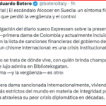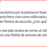 También la senadora del Centro Democrático, María Fernanda Cabal, criticó la información «Lo que dice el diario sueco @Expressen de Verónica Alcocer. Mientras Petro actúa de hombre del ‘pueblo».