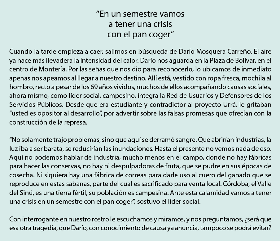 Son memorias de vida, de lucha por un pedazo de tierra, de esfuerzos por levantar un techo donde meter a la familia. Memoria de memoria. Por los noventas, en medio de temporadas de lluvias y otras secas, se consolidó el debate por la construcción de la represa Urrá. En paralelo los paramilitares, y grandes ganaderos, profundizaron la desecación para extender sus terrenos. El cauce natural del agua fue desviado de manera sistemática con una serie de caños y jarillones. Introdujeron cabezas de ganado. Expropiaron a la comunidad a punta de plomo. El miedo cundió, el silencio cubrió todo el territorio, las vistas se fijaron en los suelos que pisaban sus fuertes piernas, los murmullos pasaban de casa en casa, pero nadie se atrevió a reclamar lo suyo y los pescadores terminaron convertidos en jornaleros de sus otroras fincas.