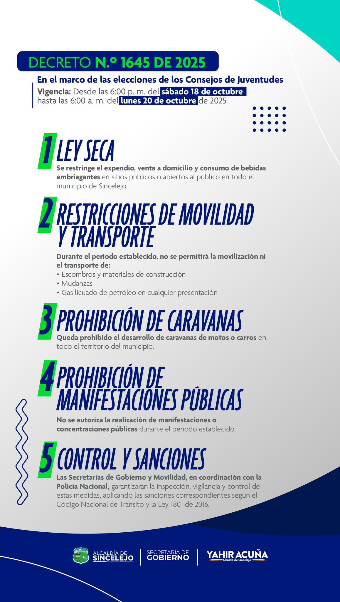 - Si vive o está en una de las ciudades que decretaron ley seca, recuerde que desde la tarde del 18 de octubre hasta la mañana del 20 de octubre no podrá comprar ni consumir alcohol en espacios públicos o establecimientos abiertos al público.