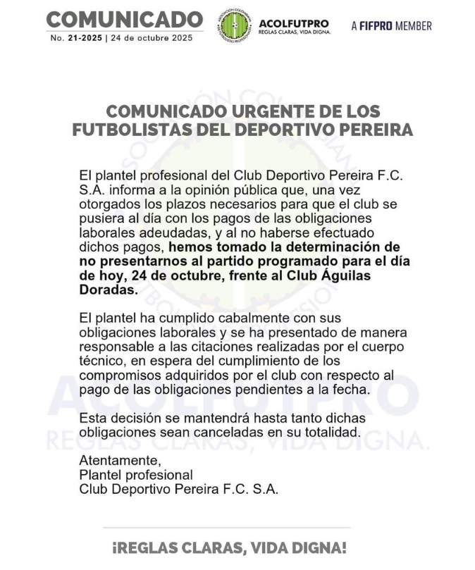 El tradicional club colombiano Deportivo Pereira, de la ciudad de Pereira (Risaralda), atraviesa una profunda crisis institucional y económica que ha escalado al punto de