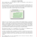 El Ministerio agregó que activó sus mecanismos internos de atención, en particular el protocolo «Voces Vivas», con el fin de garantizar la protección integral de la víctima, la confidencialidad y la no revictimización.